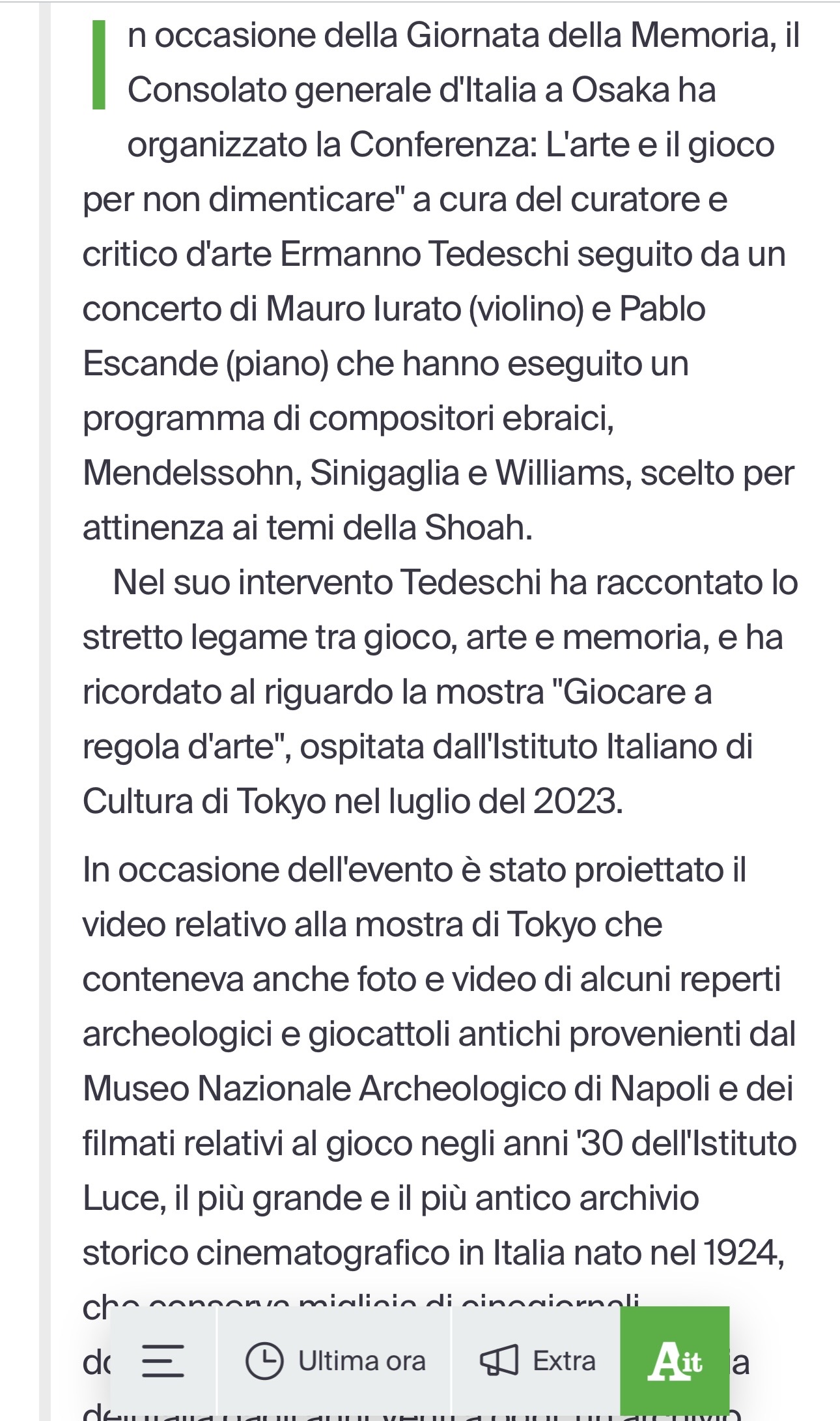 1月25日に行われました在大阪イタリア総領事館主催のコンフェレンス「L’arte e il gioco per non dimenticare (Art and play not to forget)」がイタリアAnsa通信のニュースで発信され、第2部に出演しましたMauro Iurato/Pablo Escande氏も取り上げられましたので紹介させていただきます。