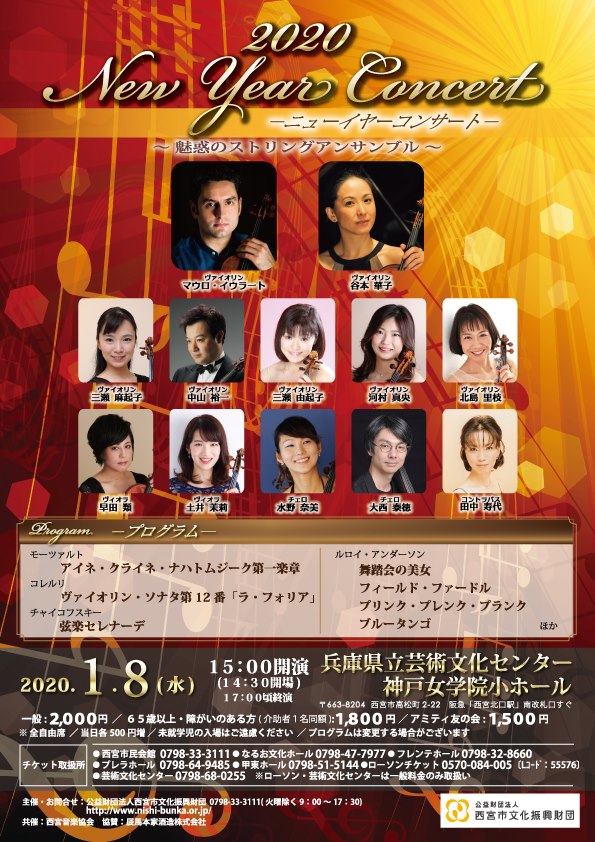 昨年度Kobe Art Awardを受賞したマウロ・イウラートや交響楽団首席奏者など今を活躍する弦楽奏者たちによるアンサンブル。新しい1年の始まりを、華やかなステージで彩ます。公益財団法人西宮市文化振興財団主催コンサート。