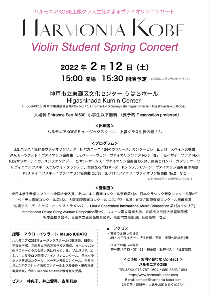 春のヴァイオリンコンサート・ハルモニアKOBEミュージックスクール上級者生徒さんによるお披露目コンサート。