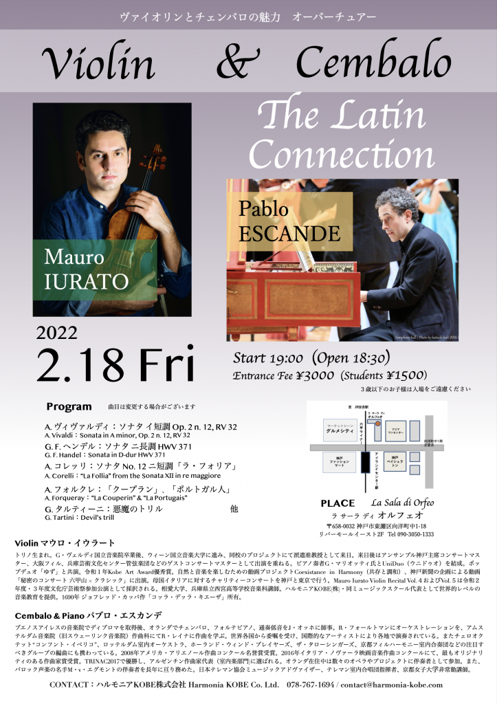 ヴァイオリニストのマウロ・イウラートとチェンバリストのパブロ・エスカンデの共演。2月27日(土)に松方ホールで行われる「MAURO & PABLO ヴァイオリンとチェンバロ・ピアノの魅力」に向けた序章。