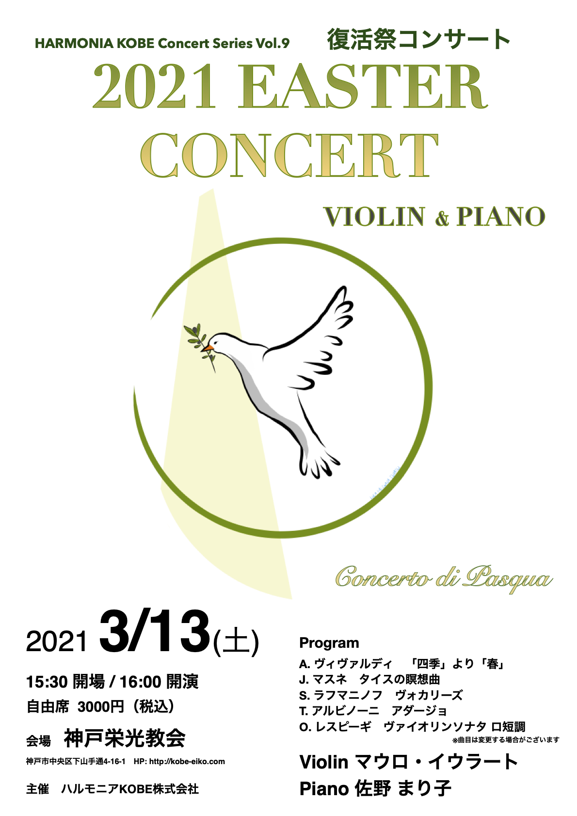 ハルモニアKOBEコンサートシリーズ第9弾は、イースターコンサートです。美しい神戸栄光教会にてヴァイオリンとピアノの演奏をお聴きください。一緒に復活祭の春の到来を喜びを分かち合いましょう。